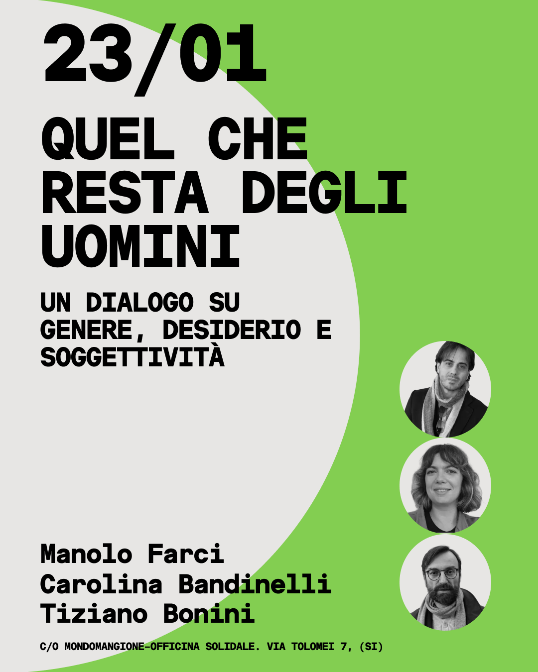 “Quel che resta degli uomini”. Un dialogo su genere, desiderio e soggettività. Con Manolo Farci e Carolina Bandinelli. Modera Tiziano Bonini.
