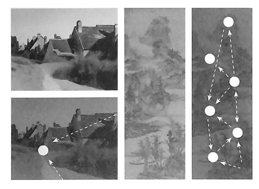 Se si prova a guardare sistematicamente la pittura occidentale, ci si accorge che funziona spesso secondo uno schema abbastanza stabile: entrata, focalizzazione, uscita. L’immagine ha un punto da cui si entra, uno in cui ci si ferma, e uno verso cui si viene spinti. Ma questo schema non è universale: è un modo culturalmente appreso di leggere le immagini. Falcinelli lo mette bene a confronto con la tradizione orientale, dove non c’è necessariamente un centro dominante, ma una pluralità di punti che invitano a restare dentro l’immagine, più che ad attraversarla.