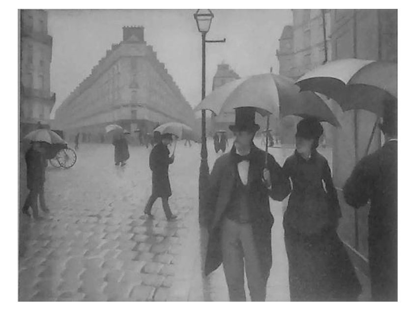 In pittura, lo stesso meccanismo è evidente in Caillebotte. In Un giorno di pioggia la fuga prospettica della strada è solo una parte del lavoro. Quello che davvero attiva l’immagine è la figura tagliata in primo piano, che entra da destra. Non è il soggetto principale, ma è il dispositivo che ci porta dentro. Senza di lui, la scena resta, ma perde intensità.